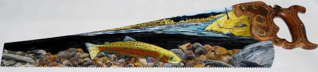 A friend commissioned this painting on a sawblade (provided) as a gift for her husband as a tribute to his father and grandfather of their favorite pastime. Both had passed on to Heaven earlier that year.